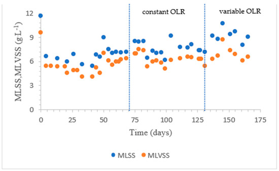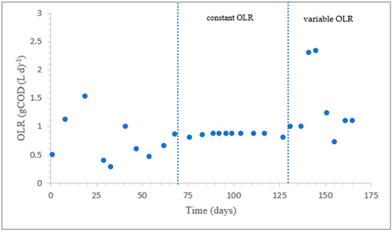 Figure 3 shows the evolution of the OLR values. The OLR was not constant when the reactor was started with the seed sludge. The initial MLSS values of the sludge were high, and sludge washout was observed due to poor sludge settling. When the sludge settling improved on day 69 (SVI30 = 113 mL·g−1), a constant OLR of 0.85 ± 0.05 gCOD·(L·d)−1 was applied by varying the volume of the influent feed. After day 130, a variable OLR was applied by a constant daily feed of 2 L influent into the reactor.