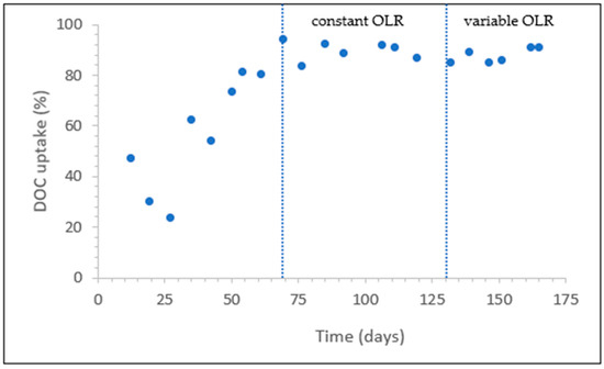 At the beginning of the experiment, the total anaerobic phase lasted 480 min, and the anaerobic DOC removal was 47% (Figure 4), which means more than half of the biodegradable substrate entered the aerobic phase. At this stage, the sludge was highly flocculated, and its sedimentation was poor (SVI30 = 155 mL·g−1). After a few days, the anaerobic DOC uptake decreased to 30% and then further to 24%. During this period, a decrease in MLSS was observed due to sludge washout. On day 35, the anaerobic DOC removal increased to 63%. On day 42, the DOC removal decreased slightly to 54%. However, the DOC removal efficiency soon reached 73% and then increased steadily to 94% on day 69. At this time, the filamentous microorganisms were almost gone from the sludge, the floc size increased, and the settling characteristics improved (see below). From day 69 to the end, the DOC removal efficiency during the anaerobic phase was over 84%. A constant OLR of 0.85 ± 0.05 gCOD·(L·d)−1 was applied from day 69 until day 130. During the constant OLR period, an average of 7.71 mg·L−1 of DOC leaked into the aerobic phase. After day 130, when a variable OLR was applied, an average of 11.45 mg·L−1 of DOC leaked into the anaerobic phase.