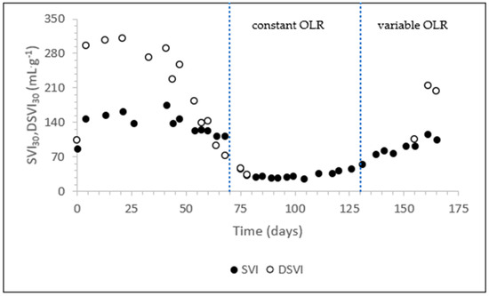 The change in settleability of the sludge is shown in Figure 6. The SVI30 of the seed sludge was 147 mL·g−1, but due to the high sludge concentration, this means it did not settle at all. The DSVI was 295 mL·g−1. From day 40, the sludge settleability improved gradually until day 70. On day 89, the SVI30 reached the value of 26 mL·g−1. The sludge settleability was stable until day 130 but then deteriorated when the reactor operation switched to the application of a variable OLR. Bad settling was caused by filamentous bulking, which continued to increase until day 166, as evidenced from microscopic analyses. Filamentous bulking resulted in poor settleability of the sludge (SVI30 values above 120 mL·g−1) [40].