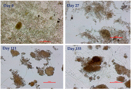 Microscopic analysis (Figure 7) was carried out to monitor the development of the sludge morphology. The structure of the flocs is an indicator of undesirable sludge characteristics. The seed sludge came from a plant where carbohydrate-rich influent is treated. The seed sludge on day 0 was free of filamentous microorganisms but had very small flocs. The complete absence of filamentous bacteria results in small, weak, and dispersed flocs [43]. On day 27, some filamentous growth appeared, which may aid in the granulation process [44]. On day 54, the flocs increased in size with the presence of a few filaments. On day 78, the filaments disappeared completely, and the flocs increased in size and were more compact in shape. During this period, the anaerobic DOC removal increased to 94% (Figure 4), indicating that the substrate had completely penetrated the flocs, resulting in smooth flocs. In addition, the settling characteristics of the sludge greatly improved during this time (SVI30 = 26 mL·g−1), as compact flocs have a high settling velocity. On day 117, some filaments reappeared on the flocs, and the size of the flocs also increased with the improved settling. On day 127, the OLR was changed from constant to variable mode. On day 151, after switching to a variable OLR operation, filaments dominated the sludge, and the settling capability deteriorated again [25]. The reason for the dominance of filamentous organisms during the variable OLR period was probably the availability of rbCOD and hydrolyzed products in the aerobic phase, as a higher amount of DOC (11.45 mg·L−1) leakage was observed in this period. The increased DOC leakage into the aerobic phase has harmful effects on densification [45,46].