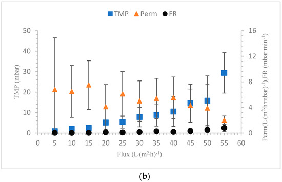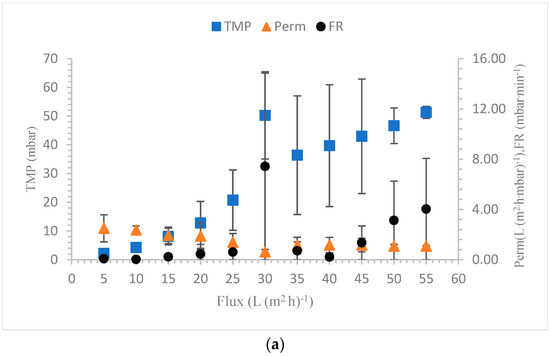 The membrane filtration process operates in two modes: the constant flux and the constant TMP modes. In the constant flux mode, the TMP rises as fouling occurs to maintain a constant flux. In the constant TMP mode, the permeability declines as a result of fouling to maintain a constant TMP. In our experiments, the constant flux mode is used for the filtration tests. For SBR sludge, the TMPavg increased with the increasing flux as the fouling potential increased. The minimum TMPavg of 0.9 mbar was observed at a flux of 5 L·(m2·h)−1, and the maximum TMPavg was observed at a flux of 55 L·(m2·h)−1, which was 29.4 mbar. The permeability first decreased and then increased at a flux rate of 15 L·(m2·h)−1. After the flux of 15 L·(m2·h)−1 was reached, the permeability decreased continuously and reached a minimum value at the flux of 55 L·(m2·h)−1. The permeability decreased as the flux rate increased and as the chances of fouling increased. When fouling occurs, the available pores for permeation become limited, which reduces the overall permeability [55]. For SBR sludge, the contribution of irreversible fouling to the initial permeability loss was almost 20%. During the relaxation step, a fraction of the cake layer was removed, which helped in regaining the permeability. At higher flux rates, the cake layers were probably too difficult to be removed completely during relaxation, leading to continuous permeability losses [56]. The sustainable flux (SF0.5) is the flux at which the fouling rate (FR) remains below the value of 0.5 mbar·min−1, as shown by Stes et al. [57]. The concept of sustainable flux is suitable to determine the practical and economic feasibility of the filtration processes. In SBR sludge filtration, the FR crossed the value of 0.5 mbar·min−1 at the flux of 50 L·(m2·h)−1. The SF0.5 value for the lab-scale SBR sludge was therefore 45 L·(m2·h)−1. The flocculent sludge from the full-scale TTC treatment plant showed very high values of TMPavg and FR and low values for permeability as compared to the lab-scale SBR cultivated sludge. First, the TMPavg increased steadily up to 10.1 mbar until a flux of 20 L·(m2·h)−1. The FR value at a flux of 20 L·(m2·h)−1 was 0.52 mbar·min−1, which showed that the SF0.5 for the full-scale sludge was 15 L·(m2·h)−1 [58]. For the TTC sludge, the contribution of irreversible fouling was 40% after the initial permeability loss. In SBR sludge filtration, the average membrane resistance due to pore blockage (Rp) was 5.3 × 1010 m−1, which was 2.1 times lower than the Rp of the TTC sludge. During the filtration of the full-scale sludge, the main reason for fouling was the cake layer with the contribution of pore blocking, while, during filtration of the lab-scale SBR sludge, pore blocking was the sole factor for fouling [59]. The comparison of TMPavg, permeability and FR of the seed sludge from full-scale and SBR cultivated sludge are shown in Figure 8a,b.