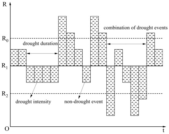 To identify the meteorological and hydrological droughts, we used the run-course theory [34]. The identification method is shown in Figure 2. An appropriate drought index was selected as the threshold values, R0, R1, and R2, based on the type of drought. A drought event was initially identified when the drought index was below R1 for a specified period. Drought events lasting only one month and with a drought index above R2 were excluded from the identified drought events. When the interval between two drought events was one month and the drought index for that month was below R0, the two drought events were combined. The duration of the drought event identified by the run-course theory is the length of the drought. The intensity of the drought event was represented by the absolute value of the sum of the drought index values below the threshold R1 for each month of the drought event. In this study, the values at which the drought index fell below 0, indicating light drought and moderate drought, were selected as the threshold values. Therefore, R0, R1, and R2 were equivalent to 0, −0.5, and −1, respectively.