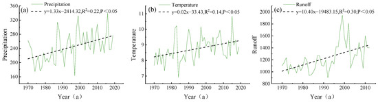 Interannual variation characteristics of precipitation (a), mean temperature (b), and runoff (c) in the MRB.