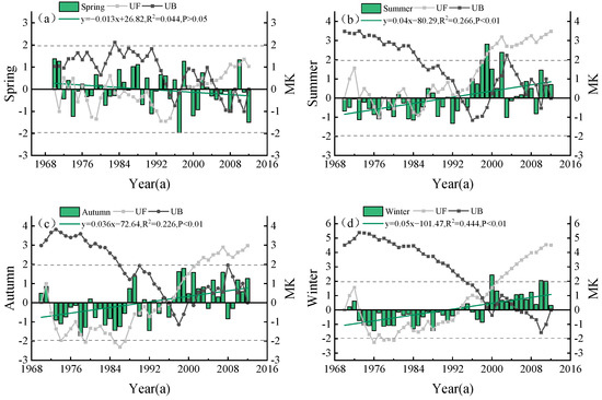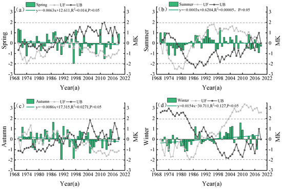 The seasonal variation trends of hydrological drought were analyzed. A non-significant downward trend was evident in spring SRI (Figure 9a) at the rate of −0.013a−1. In contrast, summer (Figure 9b), autumn (Figure 9c), and winter (Figure 9d) showed significant upward trends at confidence levels of 0.04, 0.036, and 0.05a−1, respectively. The Mann–Kendall trend analysis showed that the Z-values of the four seasons were 1.02, 3.47, 2.97, and 4.5, and all seasons except spring passed the significance test. The hydrological drought-weakening trend was evident in summer, autumn, and winter, whereas the spring SRI values alternated between the dry and wet conditions. The summer SRI was almost negative from 1970 to 1995, with light and moderate droughts. After 1995, the SRI was generally greater than zero, indicating a wet state. MDs easily occur in autumn and winter, and dry and wet states change significantly throughout the year. The UF statistics in spring did not exceed the critical threshold of 0.05 (−1.96 < UF < 1.96), indicating no abrupt point in the drought index change curve. In summer, the UF and UB curves intersect around 1993, and abrupt changes occur. Since 1998, summer HDs have decreased significantly. The UF and UB curves in autumn intersected around 1996, indicating that 1996 was a sudden change year and that the wetting state of the fall season was significant after 2001.