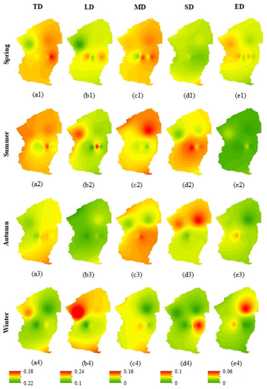 The IDW method in ArcGIS software was used to analyze the spatial distribution characteristics of drought frequency at different seasonal scales. Figure 6 shows that spring droughts ranged from 26% to 38%, with an average of approximately 31.69%. Among the three stations, Manas experienced the highest frequency of drought (38%), whereas Shihezi and Ulan Wusu experienced 32%. In spring, the frequency of LDs ranged from 10% to 20%, and all three stations were prone to this phenomenon. The frequency of MDs was between 4% and 14% and was mainly concentrated in the eastern part of the river basin. The frequency of summer droughts varied between 28% and 36%, with a maximum value of 36% in Shihezi and a minimum value of 28% in Shawan, Ulan Wusu, and Manas. Summer droughts were more frequent in the basin, and the LD frequency ranged from 10% to 24%. The frequency of MDs ranged from 4% to 16%, revealing a declining trend from north to south. The frequency of autumn droughts ranged between 26% and 34%, with a higher frequency in the east and a lower frequency in the west. The LD and SD frequencies gradually decreased from north to south. In winter, LDs were concentrated in Paotai, whereas MDs were mainly concentrated in Mossos Bay. SDs and EDs occurred less frequently during this season. The frequency of drought in spring and summer was higher than that in autumn and winter (Figure 6(a1–a4)); The frequency of LDs in autumn was lower than that in other seasons, and the frequency of LDs in winter was more severe (Figure 6(b1,b2)). EDs in the summer season were uncommon but occasionally occurred in the spring and winter months (Figure 6(e1–e4)). In summary, the study area was particularly susceptible to LDs and MDs throughout the year. It is crucial to pay close attention to the Shawan and Mosso Bay regions because they are vulnerable to severe and extreme droughts.