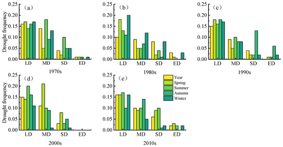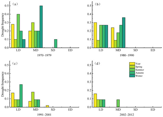 (Figure 10a–d) shows that from the annual scale, SDs rarely occurred, EDs never occurred, and the frequencies of LDs and MDs decreased each passing year. The change in LDs during spring was negligible, whereas the frequency of LDs decreased during summer. In winter, MDs occurred frequently from 1970 to 1990 (Figure 10a,b) but not after 1991. Notably, the drought frequency of all grades decreased significantly, indicating that hydrological drought was alleviated.