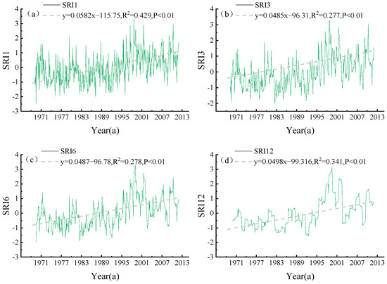 Hydrological drought was assessed using SRI1, SRI3, SRI6, and SRI12. (Figure 8a–d) shows that at a significance level of p < 0.01, all of the time scales demonstrated a significant increase at rates of 0.0582, 0.0485, 0.0487, and 0.498 a−1, respectively. The values indicate that hydrological droughts have been markedly alleviated over the last 43 years. SD and ED events mainly occurred from 1970 to 2000, with the lowest SRI values of the four scales being −2.05, −2.02, −1.89, and −1.56, respectively. After 2000, the basin mostly experienced LD events. In the short time scales of one and three months, the frequency of drought was higher in the 1970s, 1980s, and 1990s, among which SRI1 (Figure 8a) lasted the longest from September 1974 to July 1975, totaling 11 months with an average of −1.34, indicating a moderate drought level. In SRI3 (Figure 8b), the longest drought lasted from November 1983 to March 1985, reaching 17 months with an average value of −1.11.