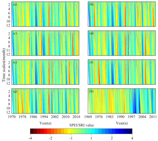 Hovmoller-type maps of the meteorological drought and hydrological drought at different time scales (1–12 months) in the MRB. Subfigures (a–h) represent the 50–year evolution characteristics of meteorological drought in the whole basin, the 50–year evolution characteristics of meteorological drought at all stations in the basin, and the 50–year evolution characteristics of hydrological drought, respectively.
