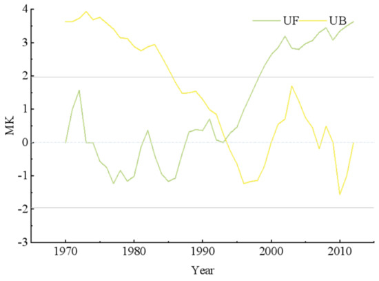 This study utilized the Mann–Kendall non-parametric trend analysis method [30,31] to investigate the meteorological and hydrological drought conditions in the MRB. This method, recommended by the World Meteorological Organization for meteorological research, is widely used to statistically analyze and assess hydrological series trends without requiring adherence to a specific distribution. The Mann–Kendall test features a high level of quantization and is highly effective in determining the direction of sequence changes. Under the observation background of long-term meteorological data, the Mann–Kendall test can also determine whether there is an abrupt climate change in the climate series. If such a change is apparent, the mutation occurrence time is determined. When the UF and UB crossing points appear, and the crossing points are between the critical lines, the corresponding moment of the crossing point is the mutation start time. If the value of the UF or UB statistic is >0, the series exhibits an upward trend. If the value is <0, it indicates a downward trend.