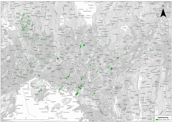 Map of green roofs in Oslo provided by Plan-og bygningsetaten, Oslo kommune.