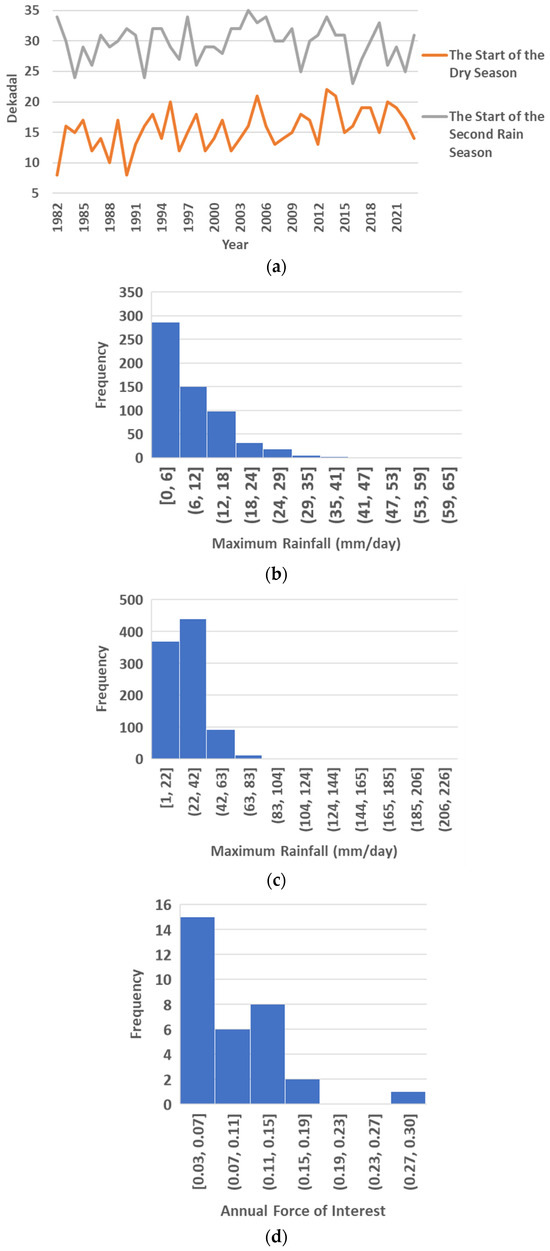 Figure 3. Data visualization of the start of dry and second rainy seasons from 1982 to 2023 (a), histogram of maximum daily rainfall data per dekadal in the dry (b) and rainy (c) seasons, and histogram of annual force of interest data (d). - c.