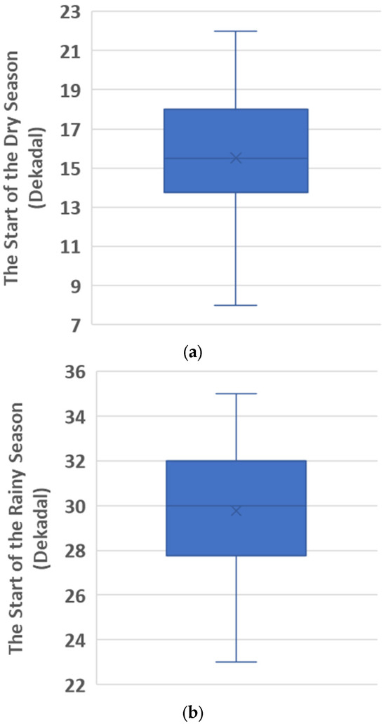 - Data for the start of the dry and the second rainy seasons from 1982 to 2023. Data have dekadal units. Both data have the same size, namely 42. The dry season starts in the 16th dekadal every year on average. Then, the earliest dry season occurs in the 8th dekadal and the latest occurs in the 22th dekadal. The second rainy season, on average, starts in the 30th dekadal every year. Then, the earliest the second rainy season occurs is in the 23th dekadal and the latest is in the 35th dekadal. A visualization of both data is given in Figure 3.