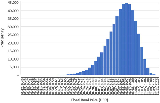 where represents the number of simulations, and is the random value of generated in the -th simulation with and . To start estimation, the values of the variables in Equation (13) are determined first. We assume that flood bonds are issued at the beginning of the st dekadal in year and have a term of years. Then, the annual coupon and redemption value are assumed to be USD and USD, respectively. Then, the trigger point for the maximum rainfall index is assumed to be mm/day. When the trigger point is exceeded, the annual coupon and redemption value are paid in the proportions and , respectively. By conducting simulations, we visually provide all the estimation results in the histogram in Figure 5. The description of all estimation results is as follows: