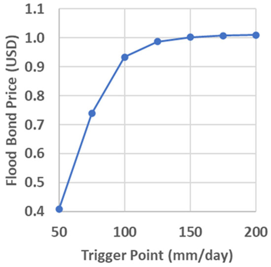 Figure 6 illustrates that trigger points positively correlate with flood bond prices. The higher the trigger point, the higher the price of flood bonds, and the lower the trigger point, the lower the price of flood bonds. This result is validated logically, where if the trigger point is high, the chance of claiming from flood bonds will be low. This results in high investor demand for these bonds. Hence, the price becomes expensive. Then, if the trigger point is low, the chance of a claim from flood bonds will be high. This results in low investor demand for these bonds. Hence, the price becomes cheap. The positive correlation results between trigger points and flood bond prices obtained in this study align with the results conducted by Chao and Zou [31] and Ibrahim et al. [33].