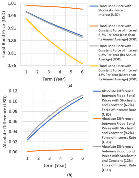 Visualization of flood bond prices with the assumption of stochastic and constant force of interest (a) and the absolute difference among them (b).