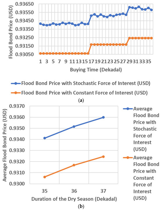 Figure 8 illustrates that flood bonds tend to have the same price at the 1st to 16th dekadal, increase at the 17th dekadal, tend to be the same again until the 28th dekadal, increase at the 29th dekadal, and tend to be the same again until the final dekadal. After this was analyzed further, we found the cause. There is a difference in the duration of the dry and rainy seasons at each buying time for the flood bonds. Flood bonds with the more extended dry season duration have the highest prices and vice versa. This cause can be visually seen in Figure 8. The more extended duration of the dry season is related to the buying time of flood bonds in the 29th to 36th dekadals. As a result, bond prices in this dekadal range are the highest compared to other dekadals. Then, the shortest duration of the dry season is related to the buying time of flood bonds in the 1st to 16th dekadals. As a result, flood bond prices in this dekadal range have the lowest prices compared to other dekadals. Rationally, it is validated because the longer the dry season duration, the lower the chance of high rainfall. Then, the lower the chance, the higher the demand for flood bonds. Hence, the price becomes high. On the contrary, when the duration of the dry season is short, the same logic applies. Then, flood bonds with a long rainy season duration have low bond prices, and vice versa. This can be visually seen in Figure 8. The longest duration of the rainy season is owned by the buying time of flood bonds in the 1st to 16th dekadals. As a result, flood bond prices in this dekadal range have the lowest prices compared to other dekadals. Then, the shortest duration of the rainy season is owned by the buying time of flood bonds in the 29th to 36th dekadals. As a result, flood bond prices in this dekadal range are the highest compared to other dekadals. Rationally, it is validated because the longer the duration of the rainy season, the higher the chance of heavy rainfall. Then, the higher the chance, the lower the demand for flood bonds. As a result, the price is low. On the contrary, when the duration of the rainy season is short, the same logic applies.