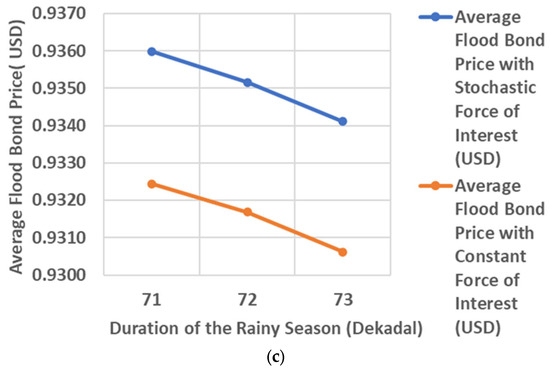 Visualization of the effect of buying time (a), duration of the dry season (b), and duration of the rainy season (c) on flood bond prices assuming a stochastic and constant force of interest.
