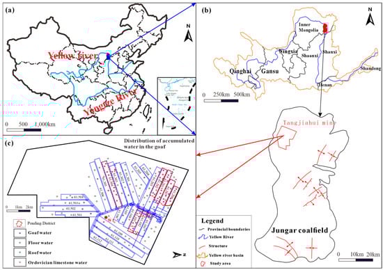 Coal is the major source of energy in China, and thus plays a crucial role in the country’s socioeconomic development []. However, the inappropriate extraction of coal resources adversely affects the groundwater system and the ecological environment [,,,]. Coal mining leads to the formation of goafs in several areas. Water gradually accumulates in these goafs from other aquifers to threaten adjacent working faces, and this reduces the productivity of coal seam mining. Such scenarios can also lead to the accumulation of acidic goaf water [,,]. A sound understanding of the process of the accumulation of water in the goaf is thus necessary for accurately predicting its volume and preventing damage to the coal mine.