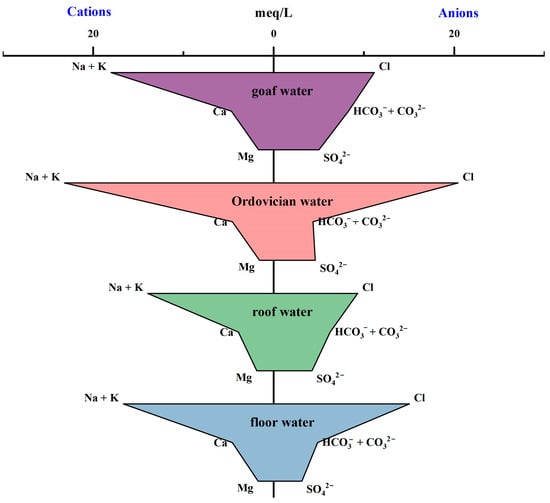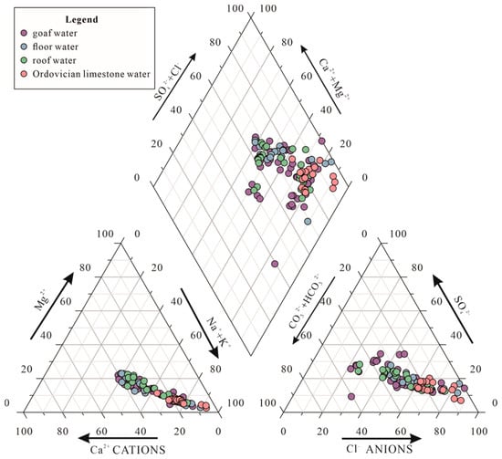The hydrochemical type in the study area is more complex in the mining area. As shown in Figure 2, anions are all close to the Cl− and SO42− end members; cations are all close to the Na and Ca end members; most of the groundwater samples are distributed in the right corner of the rhombus, with more than 50% of sulfate and chloride ions, and more than 50% of non-carbonate alkali metals. The hydrochemical type of goaf water is dominated by the Cl-Na type, followed by the SO4-Ca type, and a few are the HCO3-Na type. The hydrochemical type of roof water is mainly dominated by the Cl-Na type and SO4-Ca type, and that of the Ordovician limestone water is mainly dominated by the Cl-Na type, while the water floor water is mainly dominated by the Cl-Na type and SO4-Ca type. It can be seen that the chemical types between the goaf water and other aquifers are relatively similar, indicating that there may be some hydraulic connection between goaf water and other aquifers.