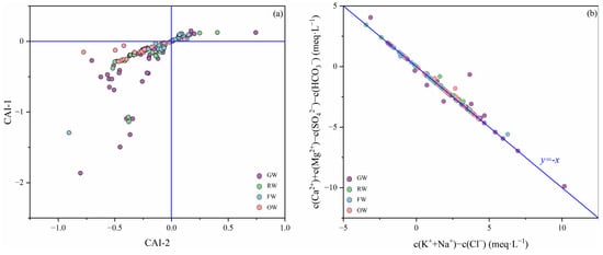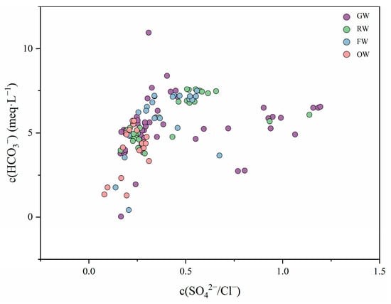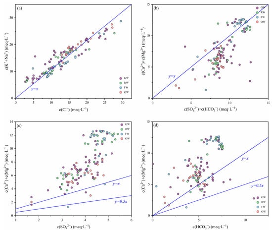 The major mineral sources in water can be analyzed using the ratio [c(Ca2+)+c(Mg2+)]/[c(HCO3−)+c(SO42−)]. As can be seen from Figure 6b, most of the water sample points from all aquifers fall below the 1:1 straight line, and some of the FW ratios are closer to 1:1, which indicates that the hydrochemical formation of both groundwaters is similar, with the presence of carbonate and silicate dissolution. GW, RW and OW deviated from the 1:1 line by a large margin, indicating that the content of HCO3−+SO42− in the water was larger than the content of Ca2++Mg2+, which was mainly originated from the dissolution of silicate. In addition, the concentration of Ca2+ and Mg2+ in the groundwater decreased due to the ion exchange between Ca2+, Mg2+ and Na++K+ adsorbed on the surface of the water-containing medium, which further confirmed the analytical results of the alternate adsorption effect.
