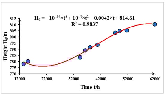 Based on the data in Table 4, Figure 7 depicts the curve of the relationship between the elevation of accumulated water in the goaf and time after mining in the Tangjiahui Coal Mine. It is clear from this that the height of water in the goaf first quickly increased, then rose relatively gently, then gradually rose once again, and finally tended to stabilize. The relationship between the height of water and the time taken is as follows: