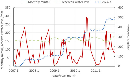 From November 2006 to December 2011, data from four displacement sensors—ZG323, ZG324, ZG325, and ZG326—were collected, providing 75 data periods. Sensor ZG323, located near the highway, provided the primary dataset for this study, supplemented by corresponding monthly rainfall and local reservoir water levels [