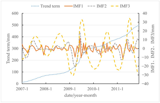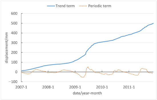 Time series data form the data foundation for this study, originating from four GNSS monitoring stations distributed across the landslide body. Due to signal interruptions and equipment failures, the data from each monitoring point are not always continuous, with varying degrees of missing information. The ZG323 monitoring point has the least data missing and is conveniently located in the middle of the landslide, making it the primary dataset for this study. Missing data from ZG323 are supplemented with data from the other three stations, resulting in a continuous time series dataset spanning from January 2007 to December 2011. GNSS monitoring data are vectorial and three-dimensional, meaning their magnitude does not directly represent accurate landslide displacement. To characterize the changes more precisely in landslide displacement, we project the vectorial displacement data along the direction of the landslide. Typically, monitoring occurs once a month, but the frequency increases during the rainy season from June to September each year, with two monitoring sessions being conducted each month. Ultimately, the number of data periods applied to the model totals 75, comprising 60 + 15 periods, where 60 represents the sum of monthly displacement data periods from January 2007 to December 2011, and 15 accounts for the sum of the second monitoring periods during the period of June to September in certain years. This ensures consistency in the direction of the data used, establishing an accurate dataset for subsequent model applications.