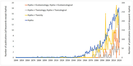 Trends in Hydra-related publications in ecotoxicology over time. The graph illustrates the number of scientific publications retrieved from the Scopus database spanning from 1844 to 2024, focusing on studies related to Hydra in the context of ecotoxicology. The data were generated by conducting searches in the Scopus database using specific keywords (Hydra, Hydra + Ecotoxicology, Hydra + Ecotoxicological, Hydra + Toxicology, Hydra + Toxicological, Hydra + Toxicity) in the article title, abstract, and keywords sections of publications. The left y-axis represents the number of publications that use the following keyword combinations: “Hydra + Ecotoxicology”, “Hydra + Ecotoxicological”, “Hydra + Toxicology”, “Hydra + Toxicological”, and “Hydra + Toxicity”. The right y-axis represents the total number of publications that use the keyword “Hydra”. The graph showcases the increasing trend in Hydra-related publications within the field of ecotoxicology over the years, reflecting the growing interest and research focus on model organisms in toxicological studies.