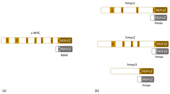 (a) Schematic structure of human c-MYC protein and its dimer partner MAX; (b) schematic structure of hydra myc proteins and their dimer partner max. MB—myc box, BR—basic region, HLH-LZ—helix-loop-helix/leucine zipper domain.