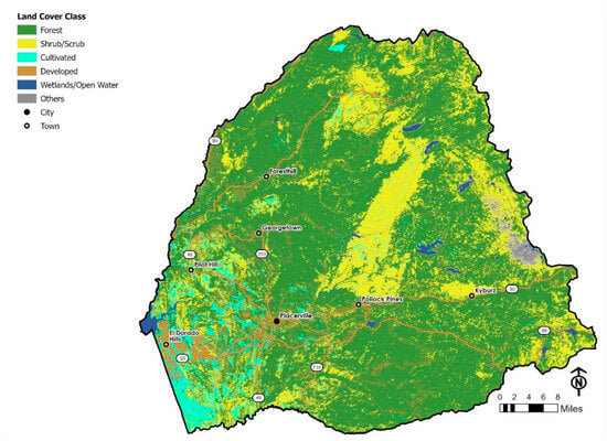 - Dewitz, J.; U.S. Geological Survey. National Land Cover Database (NLCD) 2019 Products (ver. 2.0); U.S. Geological Survey: Washington, DC, USA, 2021. [CrossRef]