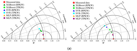 The Taylor plots (Figure 20) compare the performance of ML models in predicting dSM/H and ZSF/H for baffled and un-baffled RPKW and TPKW. The MLP model consistently demonstrates superior performance, with the highest correlation and closest alignment with measured data, indicating superior predictive performance and alignment with actual measurements. XGBoost and SVR models also perform well but with slightly lower correlation and higher deviation compared to the MLP model.