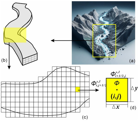 (a) Debris flow model; (b) channel model; (c) grid of channel; (d) grid cell.