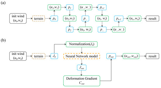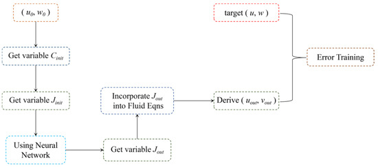 It should be noted that the deformation parameter J serves as the training output of the neural network model in this study. However, the deformation parameter Jout needs to be substituted into the fluid equations and the terrain-adapted wind field (uout, wout) computed. Subsequently, the terrain-adapted wind field (uout, wout) is utilized in training with the target wind field (u, w) to obtain the optimal solution of the neural network model. The training process is illustrated in Figure 4.