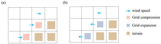 The model adopts a Z-coordinate system and employs square grids to represent the terrain and air. Following the illustration in Figure 3, grid points in the flow field are labeled as either ‘terrain’ or ‘air mass’. After specifying the initial wind speed, the wind speed values at grid points labeled as ‘terrain’ are kept constant at 0.