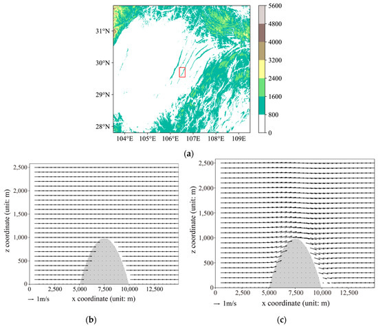 As shown in Figure 7, a mountain range in the red box of area a is selected, and a 2D x–z section is extracted as the simulation area. Panel b displays the initial field set by Fluent, while panel c shows the adapted wind field output reflecting terrain characteristics. The model is configured for ‘steady-state simulation,’ where the term refers to assuming the characteristics of fluid flow remain constant throughout the simulation, disregarding the influence of time. In this simulation, parameters such as the fluid velocity field and pressure field may vary spatially, but their changes over time at any given point are negligible.