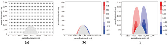 (a) Initial wind field; (b) initial deformation characteristics corresponding to the initial wind field; and (c) deformation characteristics of the flow field after adaptation to terrain (obtained through training of the neural network model).