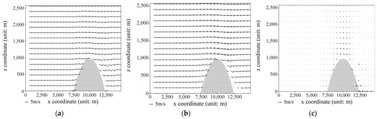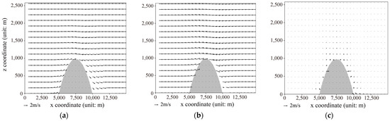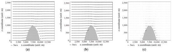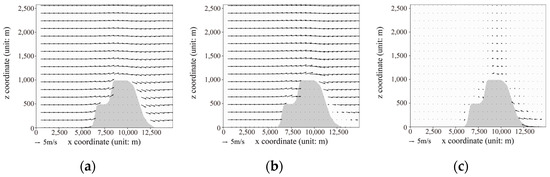 Taking an initial wind speed of 5 m/s as an example, while keeping the central point of the mountain at x = 10,000 constant, a representative 2D terrain flow profile was re-extracted from the mountain range in Figure 7a. Simulations of the terrain flow field for this profile were subsequently conducted. The simulated results were then compared. For details of the terrain profile, please refer to Figure 15.