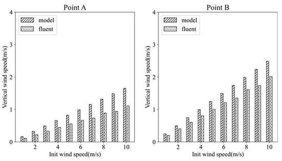 The results indicate that the neural network model’s ability to simulate the uplifting disturbance of the terrain on the airflow field can reach the simulation efficiency of the Fluent model, albeit with some degree of error. As the initial horizontal wind speed increases, the terrain uplifting effect strengthens, leading to an increase in the vertical wind speeds induced by terrain disturbances, which, in turn, amplifies the discrepancies between the two models.