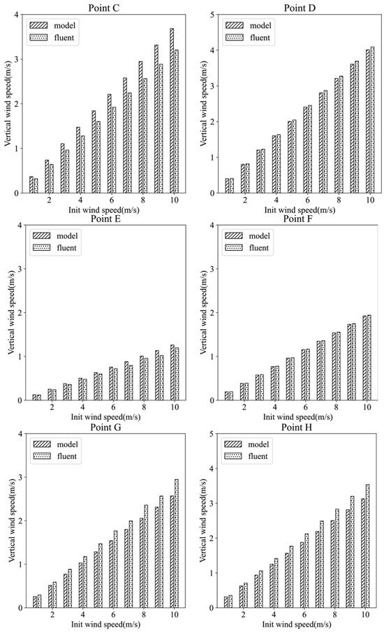 Figure 17 depicts vertical wind speeds measured at various monitoring points, comparing differences between the two models under different initial wind speed conditions. The results indicate that vertical airflow velocities over terrain correlate positively with initial horizontal wind speeds. Numerical discrepancies exist between the two models in simulating updrafts, which amplify with increasing initial wind speeds.