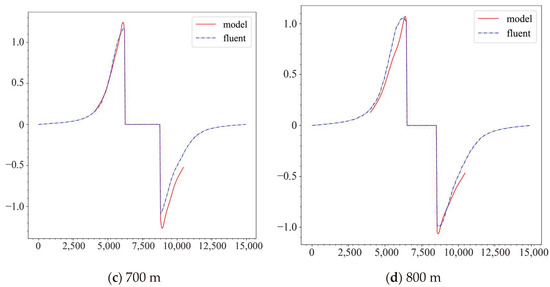 In order to further investigate the vertical velocity distribution on both sides of the mountain, this study selects the vertical velocity distribution data at different altitudes (500 m, 600 m, 700 m, and 800 m) along the dashed lines as shown in Figure 13, and presents them in Figure 13 to assess the influence of terrain disturbances on the vertical velocity distribution under the condition of a horizontal initial velocity of 5 m/s. The research results show that, on the windward slope, the upward airflow motion strengthens as it approaches the slope surface, while, on the leeward slope, a significant downward airflow motion is observed near the leeward slope. It is noteworthy that the data output by the neural network model is generally consistent with the trend of the Fluent model, but there are some errors in the calculation results, indicating room for improvement.