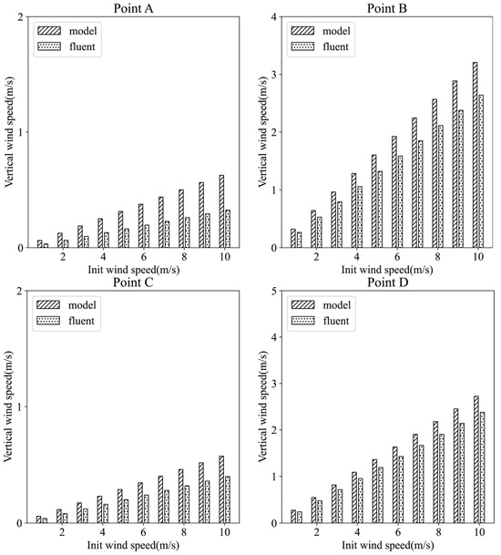 Vertical velocity distribution at each monitoring point under different initial wind speed conditions. The horizontal axis represents the initial horizontal wind speed before inputting the model (Unit: m/s), and the vertical axis represents the vertical velocity (Unit: m/s). The sub-illustrations A to D are each associated with the respective monitoring points A to D, as indicated in Figure 15.