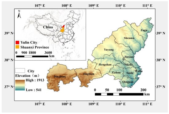 This study selects Yulin City, Shaanxi Province, China (36°57′~39°35′ N, 107°28′~111°15′ E) as the research area (Figure 1). Yulin City is located on the Loess Plateau in northwest China, with a total area of 42,920.20 km2, making it the largest prefecture-level city in Shaanxi Province, encompassing 1 county-level city, 2 districts, and 9 counties. As of 2022, Yulin City has a permanent population of 3.6161 million and a regional GDP of 654.365 billion yuan, highlighting its significant regional resource advantages, particularly in coal, gas, oil, and salt resources.