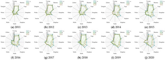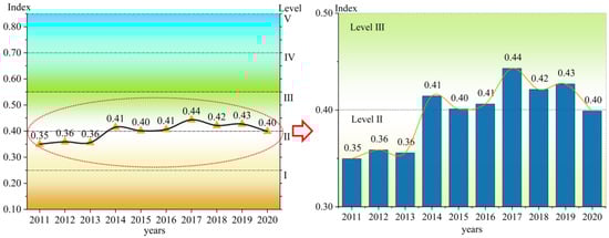 To analyze the WRCC in Yulin City from 2011 to 2020, we applied the fuzzy comprehensive evaluation model and TOPSIS model by integrating regional indicators with entropy weighting. This approach yielded respective scores for each year, culminating in an overall comprehensive evaluation score γi as shown in Figure 2. From 2011 to 2020, Yulin City’s WRCC improved from Level II to Level III, transitioning from an unsustainable development status to a sustainable maintenance status.