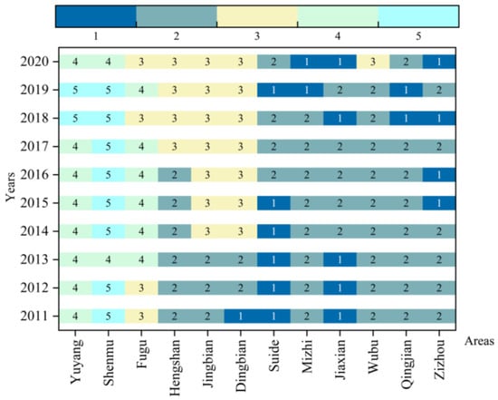 The evaluation of regional WRCC over multiple years can reflect the development status of the region. This study evaluated the WRCC from 2011 to 2020 and obtained the comprehensive evaluation results and grades of regional WRCC. The overall carrying capacity scores in the region range from [0.13 to 0.82]. This range is evenly divided into five grades, each corresponding to different degrees of development direction (Table 4).