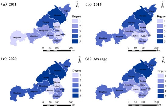 The spatial pattern of WRCC has undergone significant changes over time. In 2011 (Figure 5a), the WRCC in the northern six counties exhibited a northeast high and southwest low distribution pattern, spanning levels 1 to 5. The southern six counties showed a semi-circular distribution with high values in the southwest and low values in the center, spanning levels 1 to 2, indicating relatively minor spatial differences compared to the northern cities. By 2015 (Figure 5b), the spatial distribution pattern in the northern six counties remained stable, but with reduced spatial disparities in levels, indicating a trend towards equilibrium. Concurrently, WRCC distribution in the southern six counties evolved into a pattern with higher levels at the north and south edges and lower levels in the central areas, with unchanged level spans. In 2020 (Figure 5d), the northern six counties exhibited reduced spatial disparities in WRCC levels, with spans ranging from moderate to high (levels 3 to 4). The southern six counties showed a new pattern with lower levels in the north and higher levels in the south, with increased spatial disparities in level spans ranging from level 1 to 3, with some areas showing improved WRCC levels.