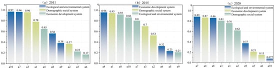 Using Geodetector, the explanatory power of various factors on regional water resources carrying capacity (WRCC) was calculated (Figure 6). The average explanatory power of WRCC is as follows: the demographic social system (0.70~0.72~0.73) shows a steady increase over time; the economic development system (0.35~0.50~0.41) initially rises and then declines; the ecological and environmental system (0.72~0.70~0.55) declines annually. Over time, the influence of the demographic and social system on WRCC was gradually strengthened, while the influence of the ecological environment system showed a weakening trend. Overall, the explanatory power of all factors on Yulin City’s WRCC mainly decreased. Moreover, each system exhibits factors with strong explanatory power for WRCC, and these factors show significant differences across different systems.