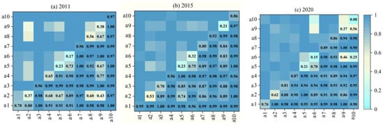 Based on the established WRCC evaluation indicator system, the weights of each indicator were determined using the entropy weight method, as shown in Table 3. It can be seen that the differences between indicators are relatively small, indicating balanced development across various dimensions. Moreover, the stability of regional development is reflected in the unchanged weights of indicators from 2011 to 2020.