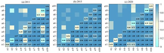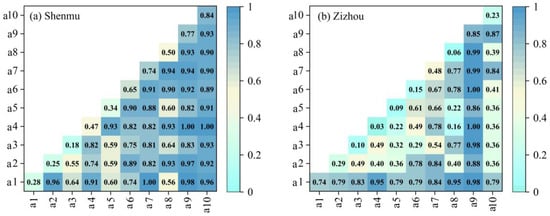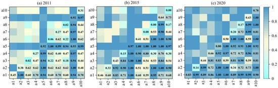 From a spatial perspective, both northern and southern regions exhibit consistent enhancement effects after factor interaction. However, the combinations of enhanced interactive factors also show significant regional differences, with notably greater enhancement in the northern six counties compared to the southern six counties. As seen in Figure 8, the effects of various factors within the population and social system of the northern six counties are all strengthened after the interaction, and the ecological environment water use rate (a10) also displays a similar trend. This phenomenon can be explained in conjunction with previous studies, indicating that the northern six counties are currently transitioning from a phase of rapid economic development to a phase emphasizing high-quality development focusing on ecological environmental quality. On the other hand, as shown in Figure 9, the interaction effects of water consumption per unit GDP in the southern six counties from 2011 to 2020 consistently exhibit very high levels. Additionally, interactions between population density and precipitation, as well as precipitation and irrigated water consumption per unit area, also demonstrate a significant strengthening trend. This indicates that the southern six counties are maintaining continuous regional economic growth by increasing resource consumption, currently facing challenges of sustainable development due to uneven resource distribution.