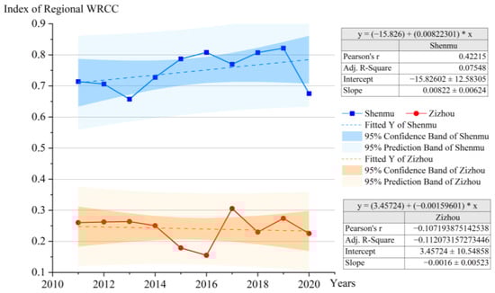 A comparative analysis of the WRCC evaluations of the best-performing Shenmu County-level City and the worst-performing Zizhou County (Figure 10) highlights the disparities in their WRCC development. From 2011 to 2020, Shenmu’s average WRCC score was 0.75, achieving a V-level rating, indicating its potential to support sustainable water resource development and utilization in the future. The linear fit result for Shenmu shows a positive slope, suggesting an overall improving trend in its WRCC. The 95% confidence and prediction intervals stabilize between 0.55 and 0.90, demonstrating that its WRCC remains at a good level or higher.