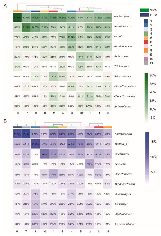 Heatmap of sewage (SEW) (A) and human-related (HUM) microbial community (B) detected in wastewater samples (top 10 most abundant genera).